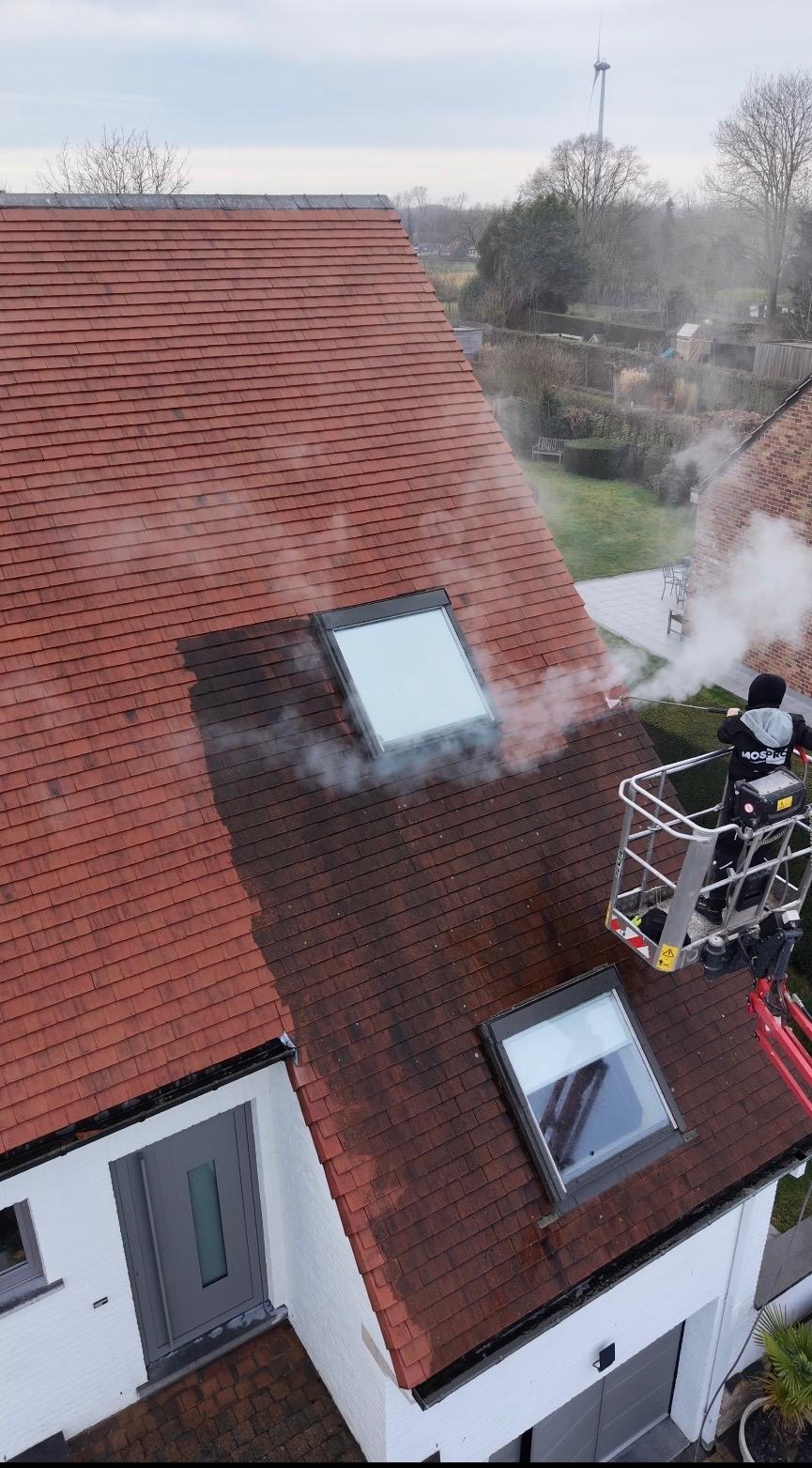Voor het ontmossen van daken gebruik ik lage druk stoomreiniging, grondig en zonder schade. Voor een blijvend resultaat raad ik aan het dak tweejaarlijks te behandelen met een anti-mosproduct, zodat mos en vuil zich nooit meer opnieuw vastzetten.